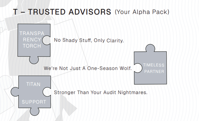 Trust is earned when advice is practical, proactive, and accountable. Wolf Global proves "Trusted Advisors" by giving clear options , explaining impact in business terms, flagging risks before they become penalties, and documenting decisions properly. We protect clients through ethical compliance, confidentiality, and transparency-what we will do, by when, and what it will cost. And we go beyond compliance: we guide on process improvements, governance, internal controls, and long-term structuring-so clients feel they have a dependable advisor who thinks like an owner, not a vendor.